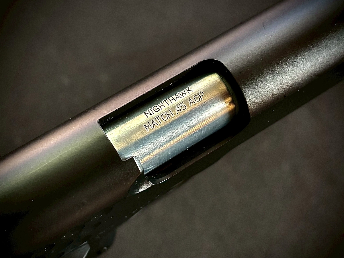 標準装備のメタルチェンバーカバーには「NIGHT HAWK MATCH .45 ACP」とあります。